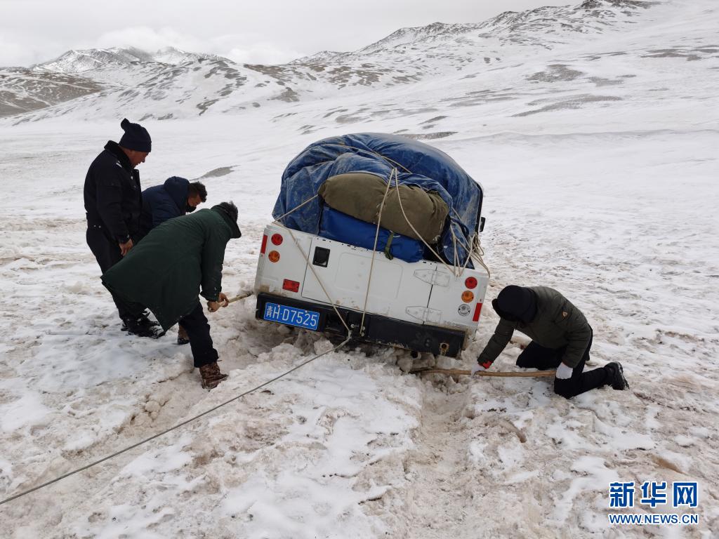 2020年3月,袁廣明(右一)和巡山隊(duì)員一起在可可西里巡山途中解困被陷車(chē)輛。新華社發(fā)