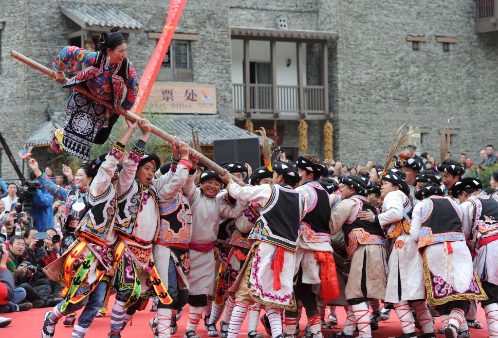 羌族同胞在四川省阿壩藏族羌族自治州理縣桃坪羌寨進行推桿比賽。新華社 何海洋 攝