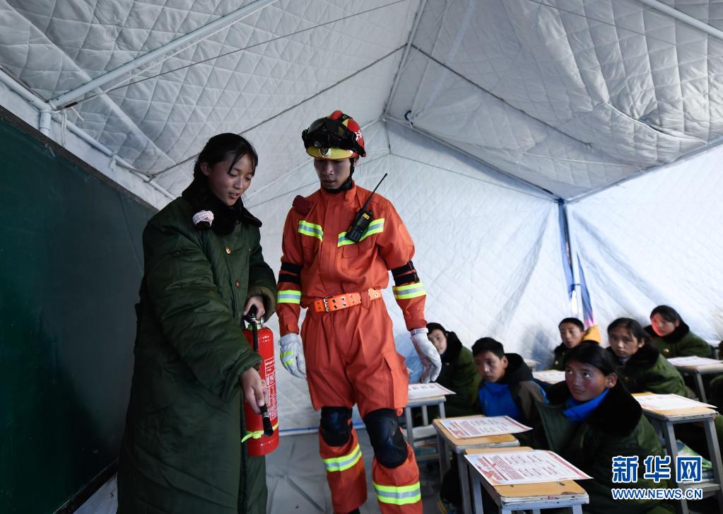 5月24日,青海果洛州消防救援支隊隊員在指導(dǎo)曲邁卓瑪(左一)學(xué)習(xí)防災(zāi)避險知識。新華社 張龍 攝