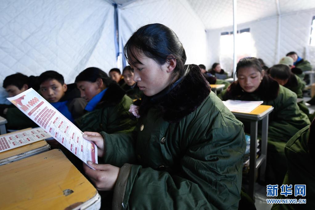 5月24日,曲邁卓瑪在瑪多縣民族寄宿制中學(xué)帳篷教室里學(xué)習(xí)防災(zāi)避險知識。新華社 張龍 攝