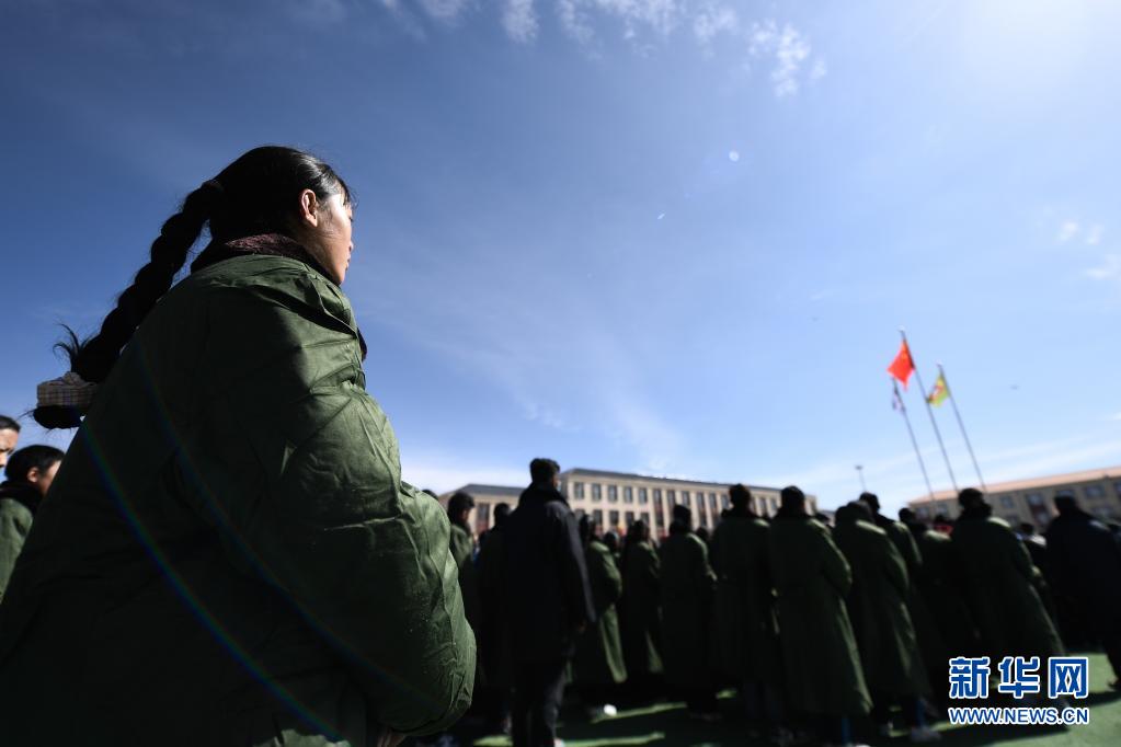 5月24日,曲邁卓瑪(左一)在瑪多縣民族寄宿制中學(xué)參加升旗儀式。新華社 張龍 攝