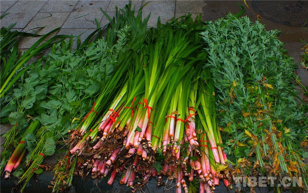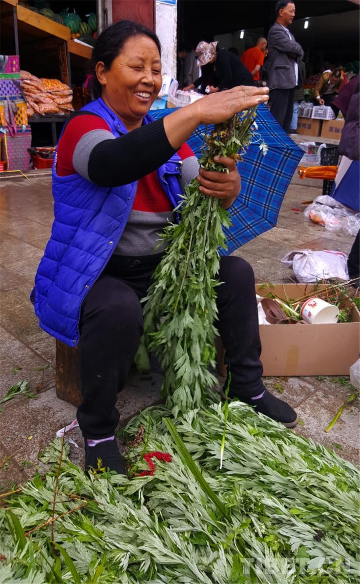 圖為藏族婦女懷抱剛買的菖蒲、艾葉