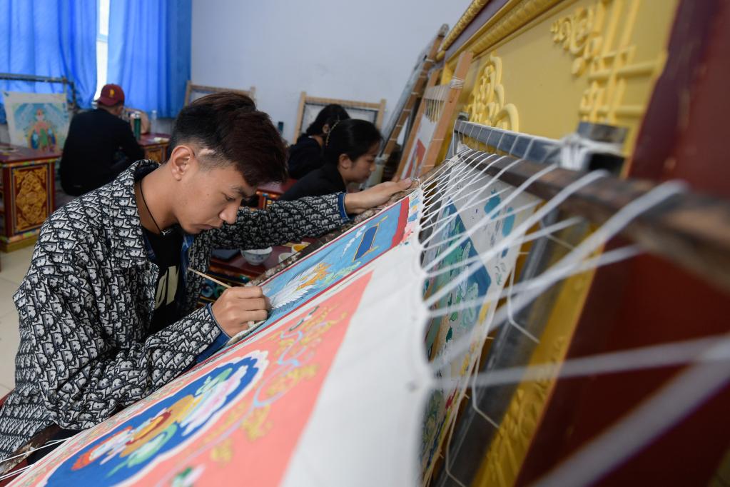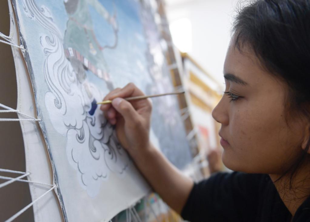 6月17日,在青海民族大學藝術(shù)學院,工藝美術(shù)(唐卡)專業(yè)學生在繪制唐卡。新華社記者 張曼怡 攝