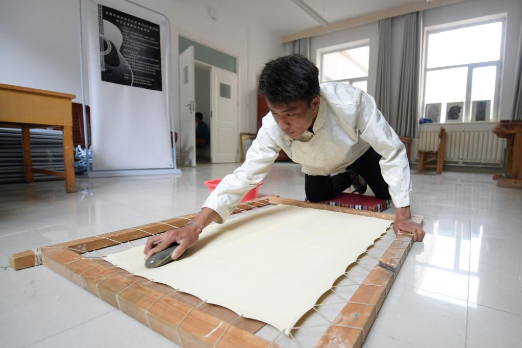 6月17日,在青海民族大學藝術(shù)學院,工藝美術(shù)(唐卡)專業(yè)學生在制作唐卡畫布。新華社記者 張龍 攝