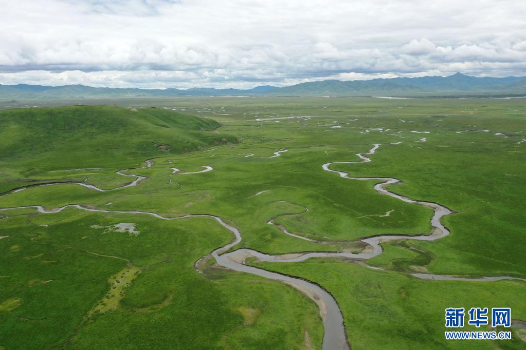 這是7月15日拍攝的瑪曲縣阿萬倉濕地(無人機(jī)照片)。新華社記者 文靜 攝