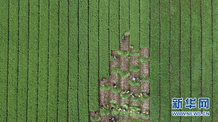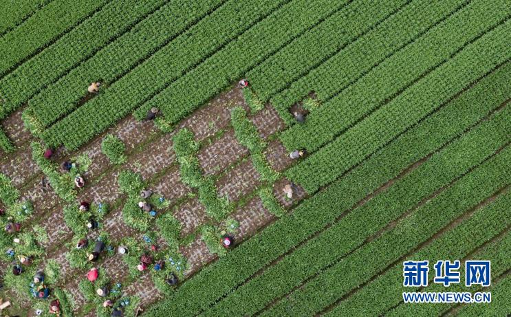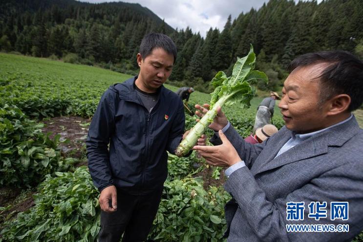 8月13日,在四川省阿壩藏族羌族自治州紅原縣刷經(jīng)寺鎮(zhèn)加當(dāng)村,農(nóng)業(yè)技術(shù)推廣研究員茍俊(前右)在查看收獲的萵筍生長情況。新華社記者 江宏景 攝