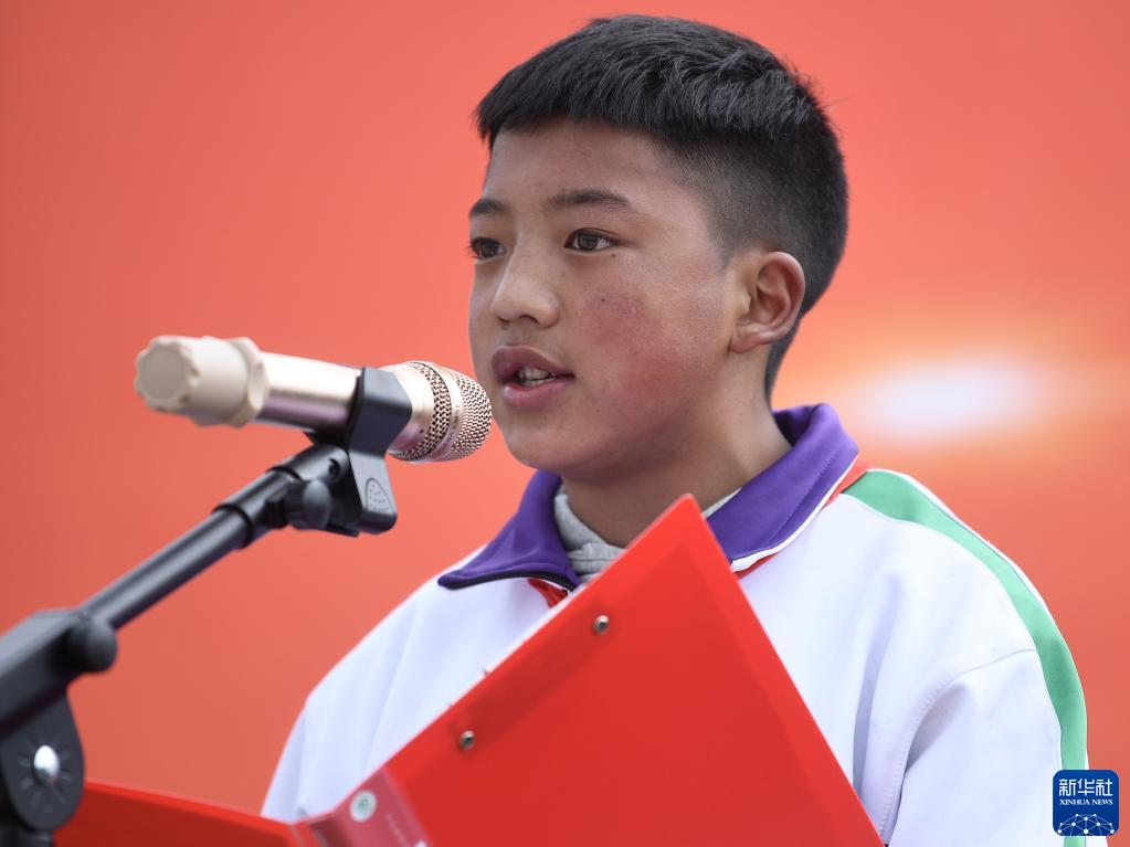 9月1日,在位于果洛藏族自治州瑪沁縣的瑪多地震災(zāi)后過渡安置一校區(qū),學(xué)生科熱在國旗下講話。新華社記者 張龍 攝