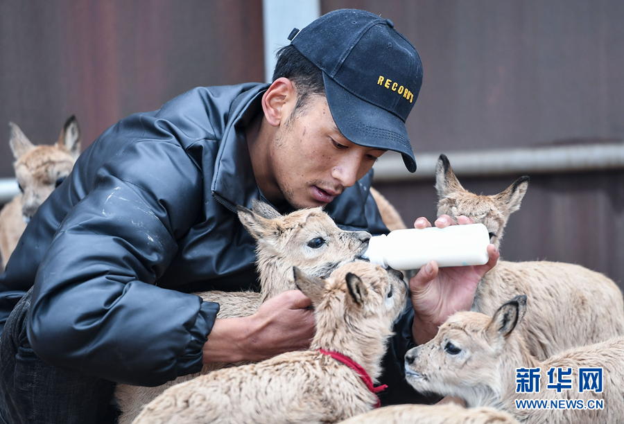 2020年7月7日,三江源國(guó)家公園管理局長(zhǎng)江源園區(qū)可可西里管理處卓乃湖保護(hù)站的工作人員在給藏羚羊幼仔喂奶。新華社記者 薛玉斌 攝