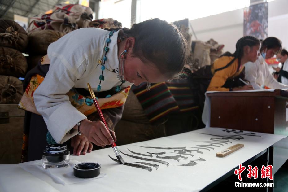 圖為小學生書寫藏文書法。張?zhí)砀?攝