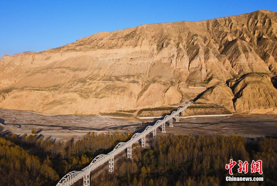 10月16日,航拍青海省海南藏族自治州貴德縣拉西瓦灌溉工程中建設的渡槽。中新社記者 馬銘言 攝