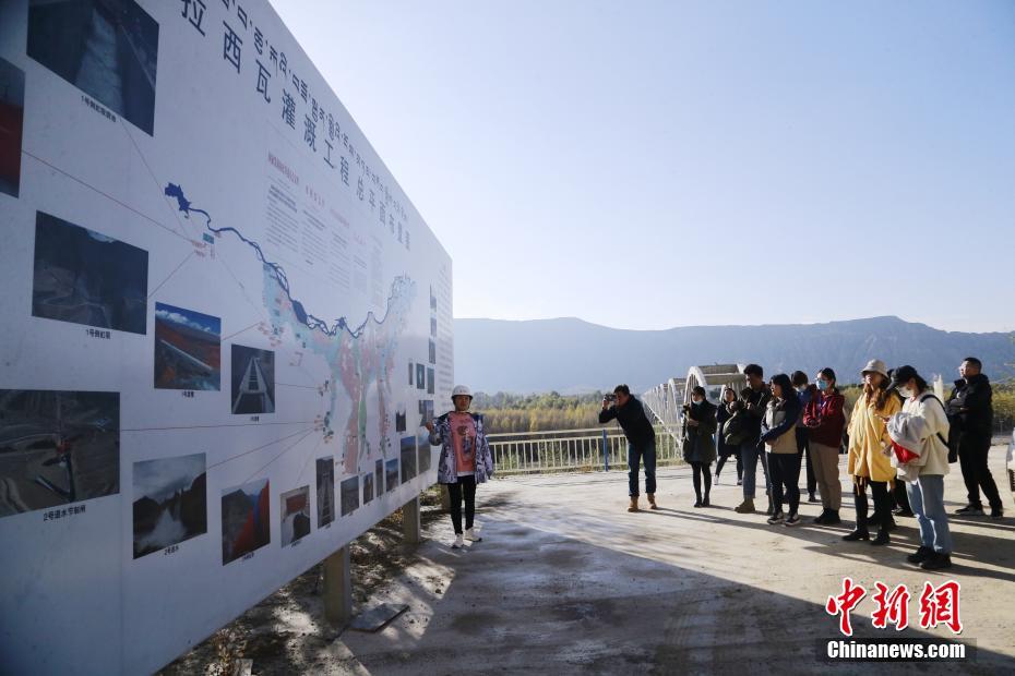 10月16日,青海省海南藏族自治州貴德縣拉西瓦灌溉工程建設點,工作人員向記者介紹該工程項目進展。中新社記者 馬銘言 攝