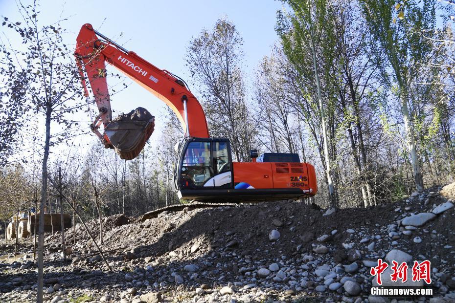 10月16日,青海省海南藏族自治州貴德縣拉西瓦灌溉工程中的一處建設點,工人用挖掘機施工。中新社記者 馬銘言 攝