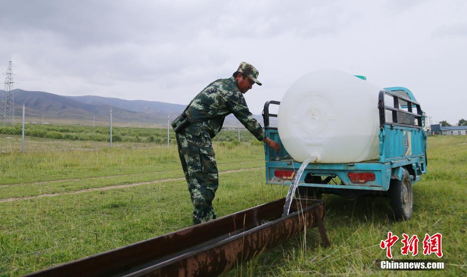 9月27日,在青海省海南藏族自治州共和縣青海湖國(guó)家級(jí)自然保護(hù)區(qū)南岸保護(hù)站內(nèi),管護(hù)員往普氏原羚的水槽內(nèi)添水。中新社記者 馬銘言 攝