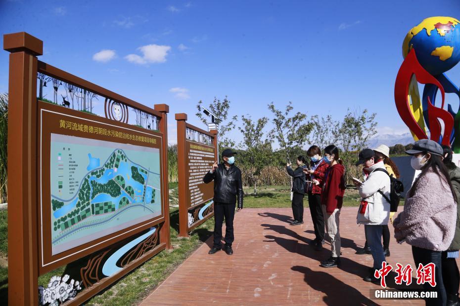 10月16日,青海省海南藏族自治州貴德縣蘆花灣水生態(tài)公園內(nèi),工作人員向記者們介紹該項(xiàng)目進(jìn)展與成效。 中新社記者 馬銘言 攝