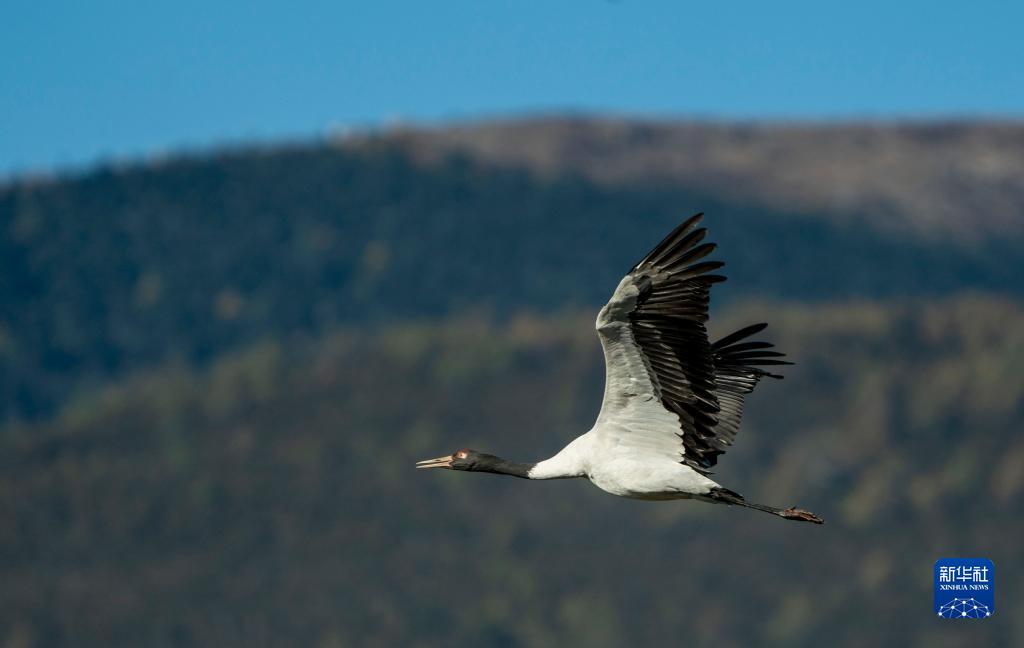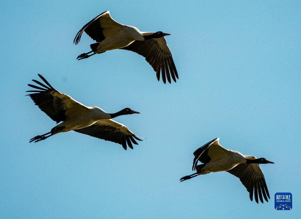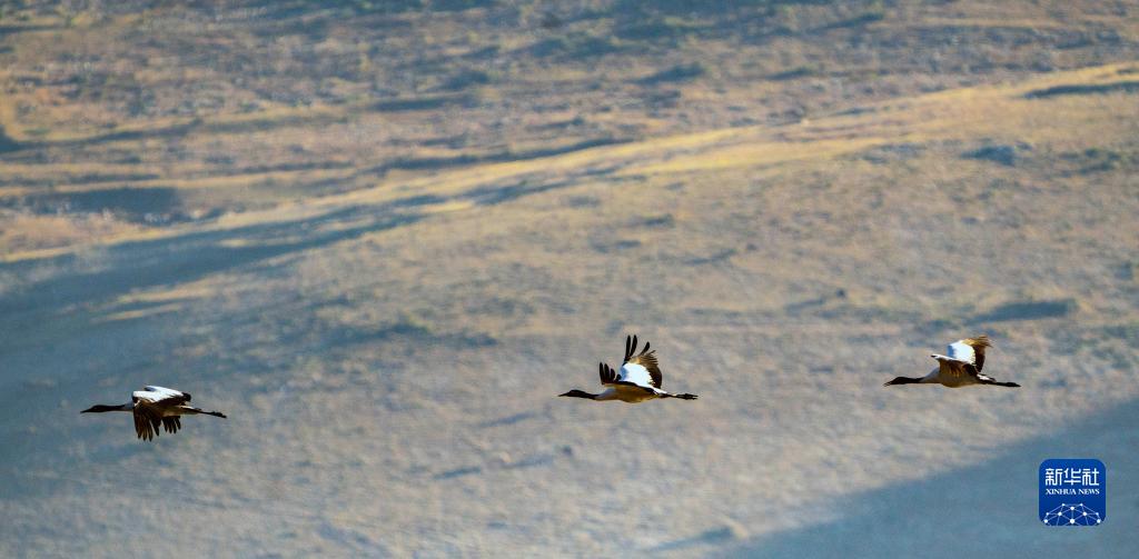 10月29日,黑頸鶴飛翔在納帕海上空。新華社記者 江文耀 攝
