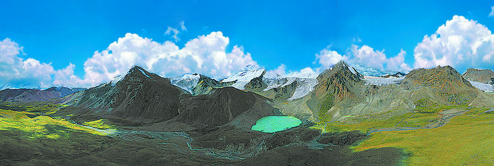 遠(yuǎn)眺索布查葉,山脈頂部云霧環(huán)繞,山坡上青翠欲滴,山腳下無數(shù)銀鏈般的細(xì)流在廣袤的草地上開枝散葉。