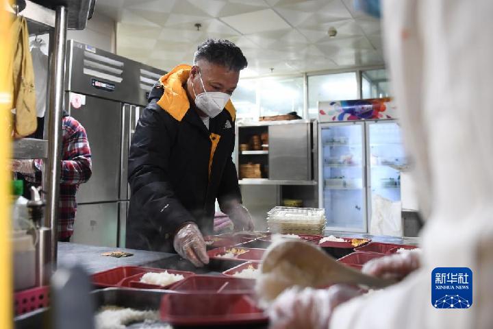 10月31日,羅宗周正在為西寧勝利路一社區(qū)核酸采樣點(diǎn)送愛心餐。新華社記者 吳剛 攝