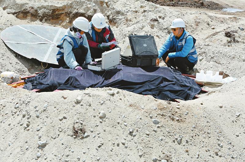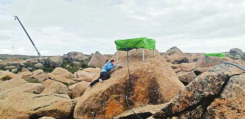 2020年5月15日,科研人員匍匐在巨石上安裝電磁粒子探測(cè)器。