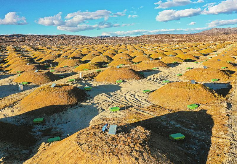 10月11日,放眼望去,觀測(cè)基地周邊均勻分布著壯觀的土堆,這就是繆子探測(cè)器。每個(gè)土堆大概有36平方米大小,土堆下是一個(gè)直徑6.8米、高1.2米的混凝土罐體,罐體中放置了裝有超純水的高反射率水袋。