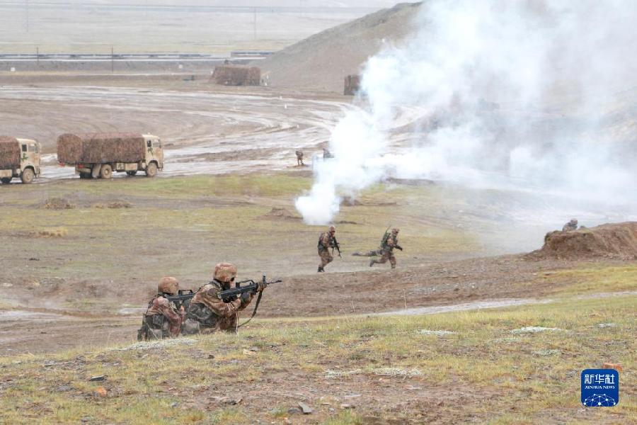 聯(lián)勤保障部隊汽車運輸某團一營一連參加高原駐訓時,在行車途中組織官兵進行防衛(wèi)演練(2020年6月16日攝)。新華社發(fā)