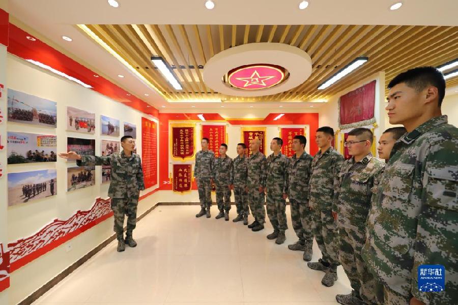 聯(lián)勤保障部隊汽車運輸某團一營一連連長孟凡龍(左一)為新兵講述連隊歷史(7月11日攝)。新華社發(fā)