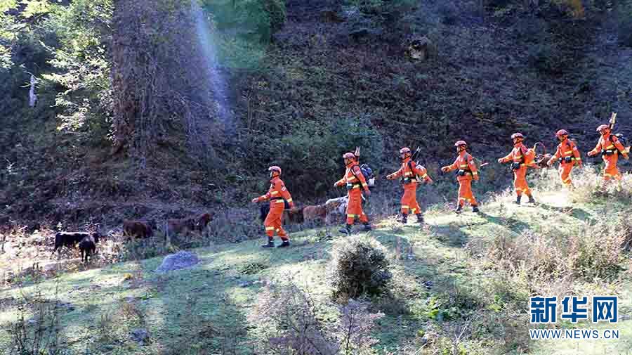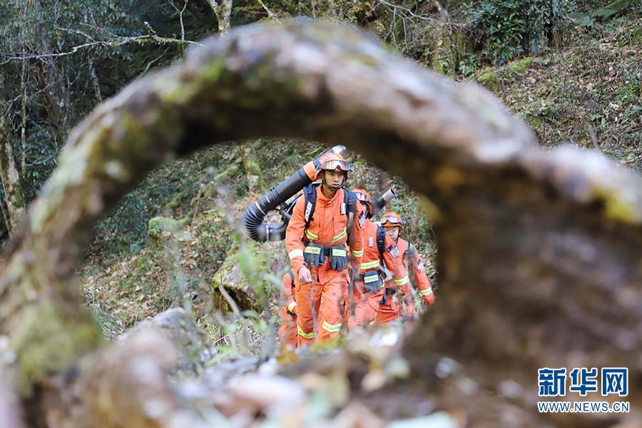 森林消防員開展攜裝巡護(攝于11月5日)。新華網(wǎng)發(fā)(云南省森林消防總隊迪慶大隊供圖)