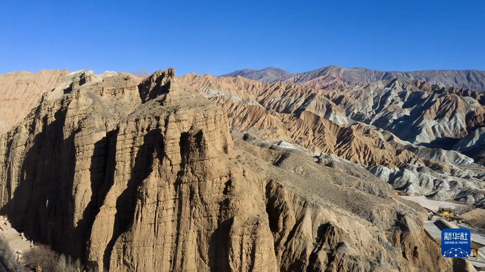 冬日,在青海省海南藏族自治州貴德縣,多彩的丹霞地貌在陽光照耀下形成一幅美麗畫卷。