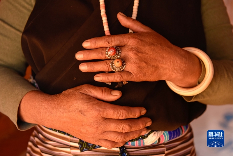 圖為巴塘縣中咱鎮(zhèn)仁德村村民澤仁志瑪展示她的戒指。 新華社記者 胥冰潔 攝