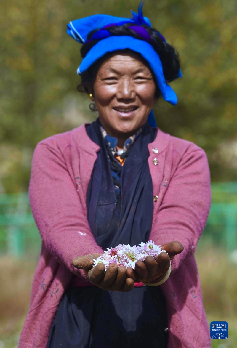 圖為一位郎達(dá)村村民在展示她收獲的藥菊。 新華社記者 劉坤 攝