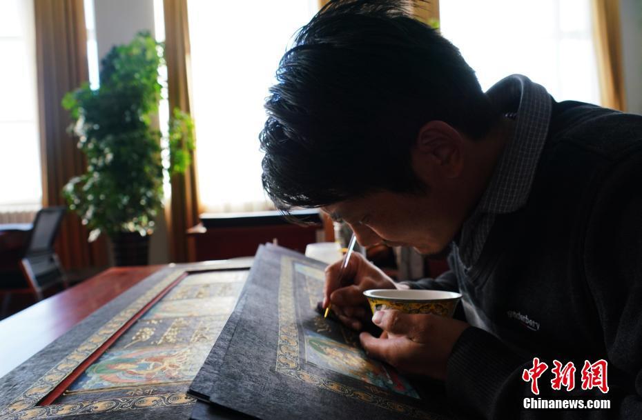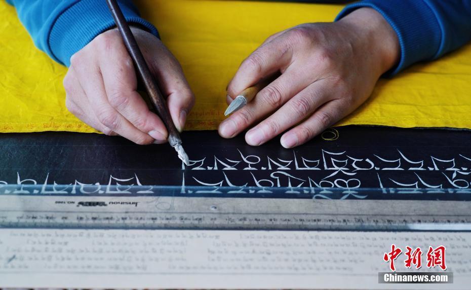 1月18日,青海省黃南藏族自治州尖扎縣非物質(zhì)文化遺產(chǎn)綜合傳習中心內(nèi),學員正在抄寫經(jīng)文。該中心現(xiàn)有50名學員學習藏文書寫、唐卡繪制、藏紙手工制作技藝等。他們在學習、了解豐富多彩的藏族文化知識外,每年還可增收近5萬元人民幣。中新社記者 馬銘言 攝