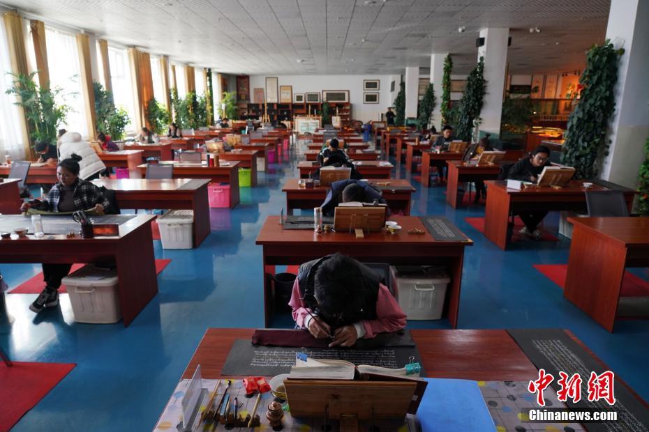 1月18日,青海省黃南藏族自治州尖扎縣非物質(zhì)文化遺產(chǎn)綜合傳習中心內(nèi),學員們正在抄寫經(jīng)文。該中心現(xiàn)有50名學員學習藏文書寫、唐卡繪制、藏紙手工制作技藝等。他們在學習、了解豐富多彩的藏族文化知識外,每年還可增收近5萬元人民幣。中新社記者 馬銘言 攝