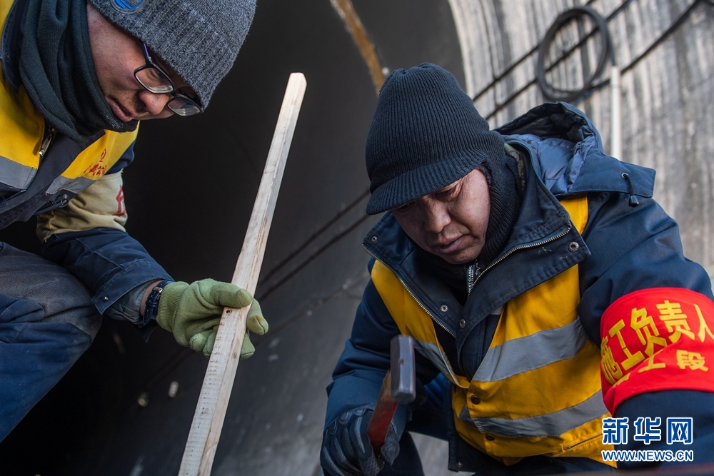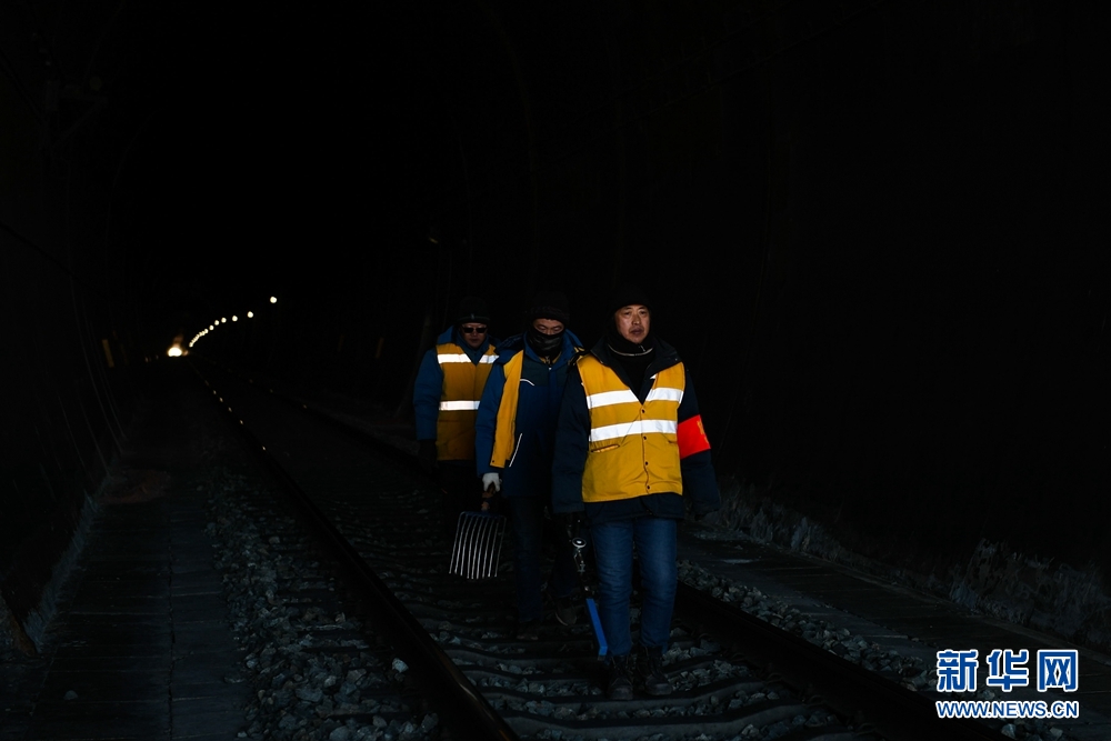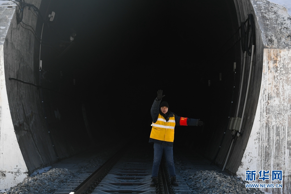 隧道內(nèi)凜冽寒風(fēng)吹得人幾乎站不住腳,呼呼的風(fēng)穿透身體。鄂年明頂著風(fēng),手拿測量工具,走走停停,還不時跪在零下三四十度的鋼面上,仔細(xì)查看線路平順情況。