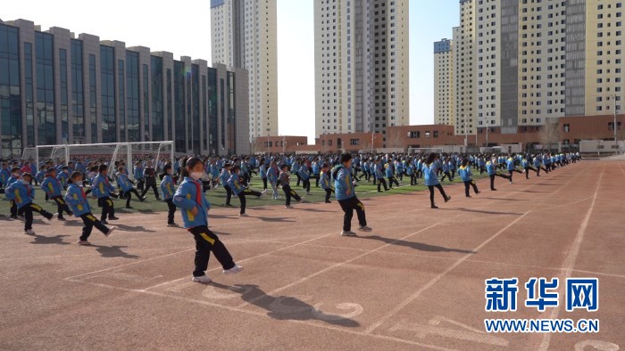 22日,蘭州新區(qū)第二小學(xué)學(xué)生們?cè)诓賵?chǎng)上做課間操。新華社記者 王紫軒 攝