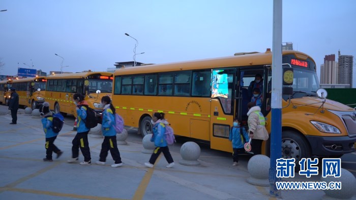 開學(xué)第一天,蘭州新區(qū)第二小學(xué)學(xué)生乘坐校車上學(xué)。新華社記者 王紫軒 攝