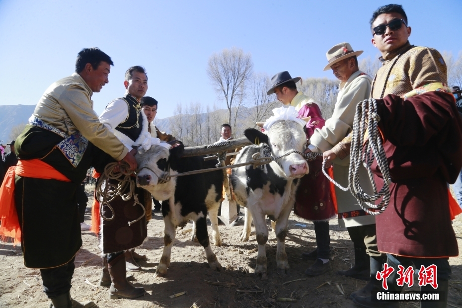 2月24日,藏族民眾用“二牛抬杠”的傳統(tǒng)方式開(kāi)啟新春第一犁。中新社記者 馬銘言 攝