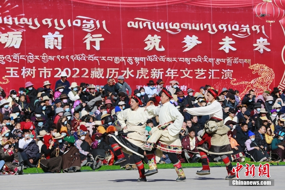 3月3日,在青海省玉樹藏族自治州玉樹市,藏族民眾進(jìn)行歌舞表演,共慶藏歷水虎新年。當(dāng)日是藏歷水虎新年正月初一,玉樹市藏族民眾身穿華麗服裝,跳起歡快的藏族舞蹈,共慶藏歷水虎新年。部分民眾來(lái)到嘉那瑪尼石經(jīng)城轉(zhuǎn)經(jīng)朝拜,煨桑祈福新的一年五谷豐登、吉祥如意。 中新社記者 馬銘言 攝