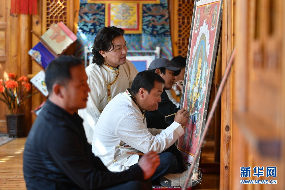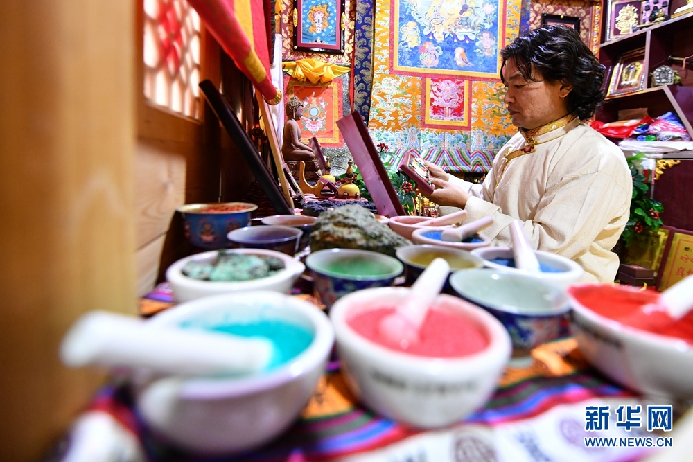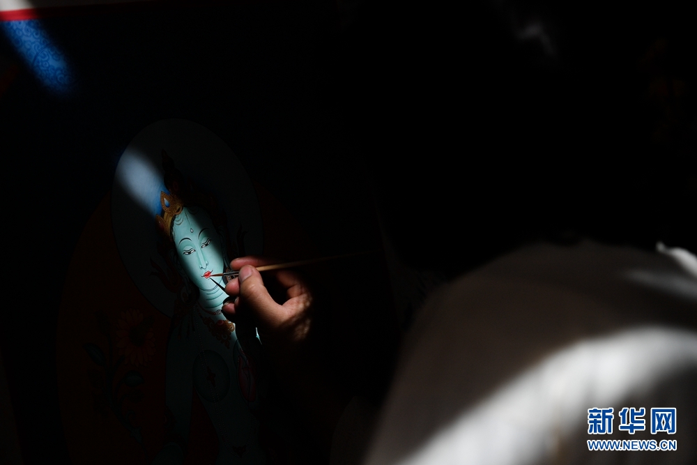為了更好地傳承和發(fā)揚(yáng)熱貢唐卡繪畫技藝,格桑嘉措又相繼拜多名唐卡大師為師,虛心接受指導(dǎo),刻苦練習(xí)唐卡技藝,將大師們高超的繪畫技藝與家傳技藝融會貫通,使得他的繪畫功底得到了很大的提升。圖為格桑嘉措在繪制唐卡作品。