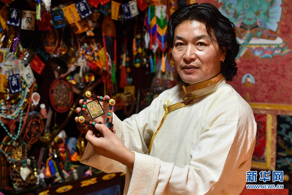 同仁市“脫貧攻堅(jiān)社會扶貧先進(jìn)個人”、黃南州“優(yōu)秀共產(chǎn)黨員”、青海省“綠色家庭示范戶”……近年來,格桑嘉措不僅通過自己的努力,帶動當(dāng)?shù)刎毨艟偷貏?chuàng)業(yè),還積極投身各項(xiàng)公益活動中,自2014年至今,已累計(jì)捐款捐物72萬元。圖為格桑嘉措在唐卡展廳內(nèi)整理他創(chuàng)作的文創(chuàng)產(chǎn)品。