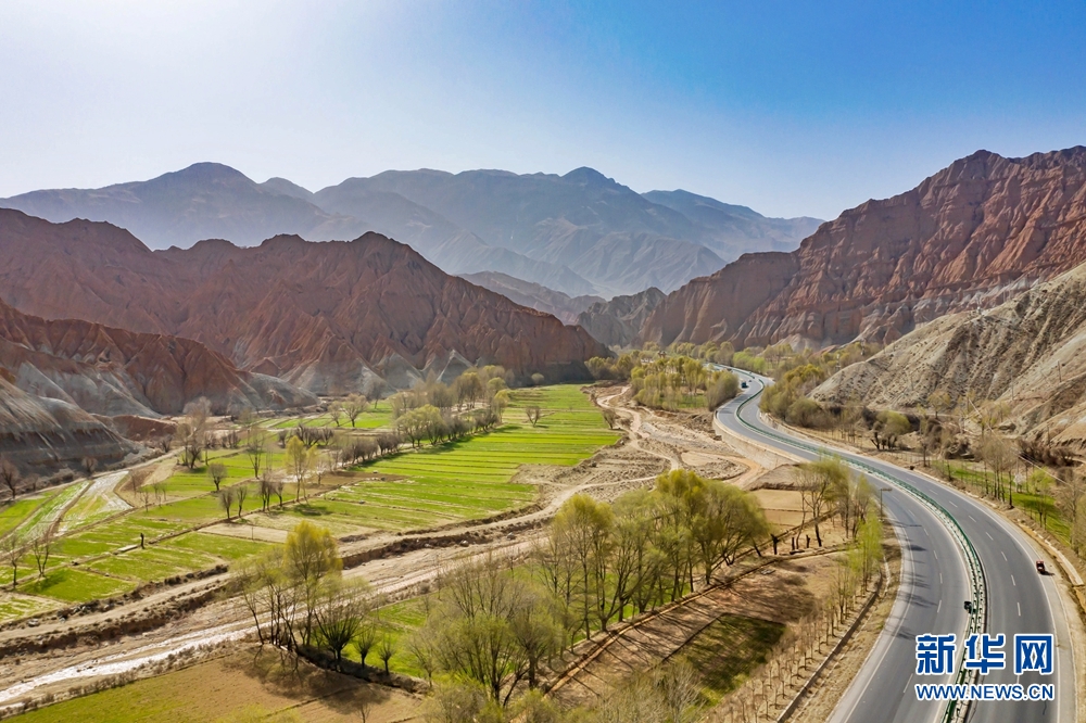 公路蜿蜒在丹霞峽谷中,四周山脈層層疊起,工整而靈動,風景絕美。新華網(wǎng) 宋忠勇 攝