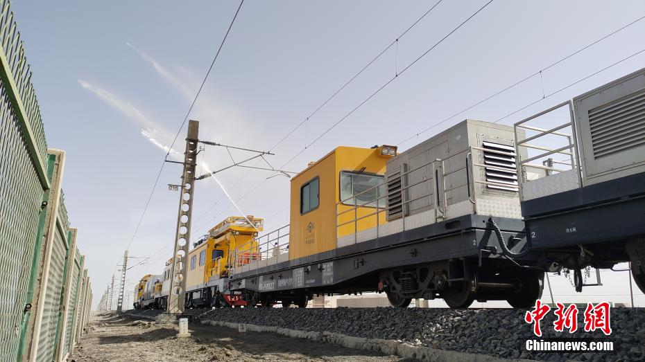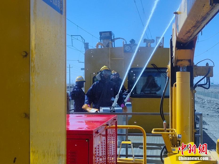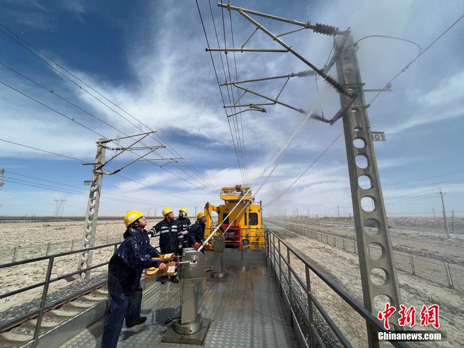 察爾汗鹽湖區(qū)域空氣中鹽分含量高,在這片區(qū)域,春秋季大風(fēng)不僅揚(yáng)沙還會(huì)揚(yáng)鹽,很容易在鐵路牽引供電接觸網(wǎng)設(shè)備上形成鹽污,造成線路跳閘,遇到雨雪天氣就會(huì)放電,造成大面積跳閘,誘發(fā)行車(chē)安全事故。圖為接觸網(wǎng)工操作水炮進(jìn)行清洗作業(yè)。 王文誠(chéng) 攝