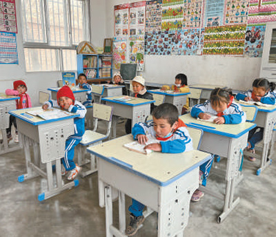 2017年,隨著易地扶貧搬遷政策的落實,越來越多村民選擇搬到山腳開始新的生活。學(xué)校里的孩子們由32名減少到9名?!?個孩子有7個是留守兒童,最大的8歲,最小的3歲?!蓖昝慈试霭押诎宸殖蓛蓧K,左邊是一年級,右邊是學(xué)前班,“安排了語文、數(shù)學(xué)、美術(shù)、道德與法治4門課,采用復(fù)式班的教學(xué)模式”。