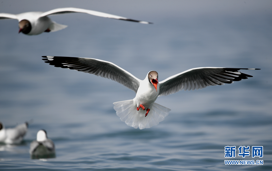 在青海湖畔,一只棕頭鷗正在捕食。