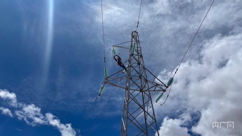 電力線路工在18米鐵塔檢修懸式絕緣設(shè)備(央廣網(wǎng)發(fā) 周賀 攝)