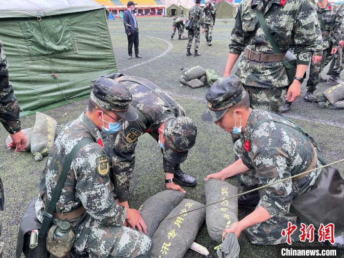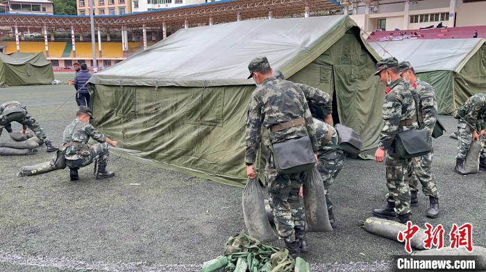 記者10日從四川省阿壩州委宣傳部獲悉,6月10日凌晨,四川阿壩州馬爾康市多次地震發(fā)生后,武警四川總隊阿壩支隊第一時間趕到震區(qū)周邊居民密集區(qū)域,擔負搭建安置點、安撫群眾、巡邏執(zhí)勤等任務。今天清晨五點,災區(qū)又出現(xiàn)降雨天氣,武警官兵們在馬爾康市城區(qū)應急避難場所,緊急搭建帳篷。