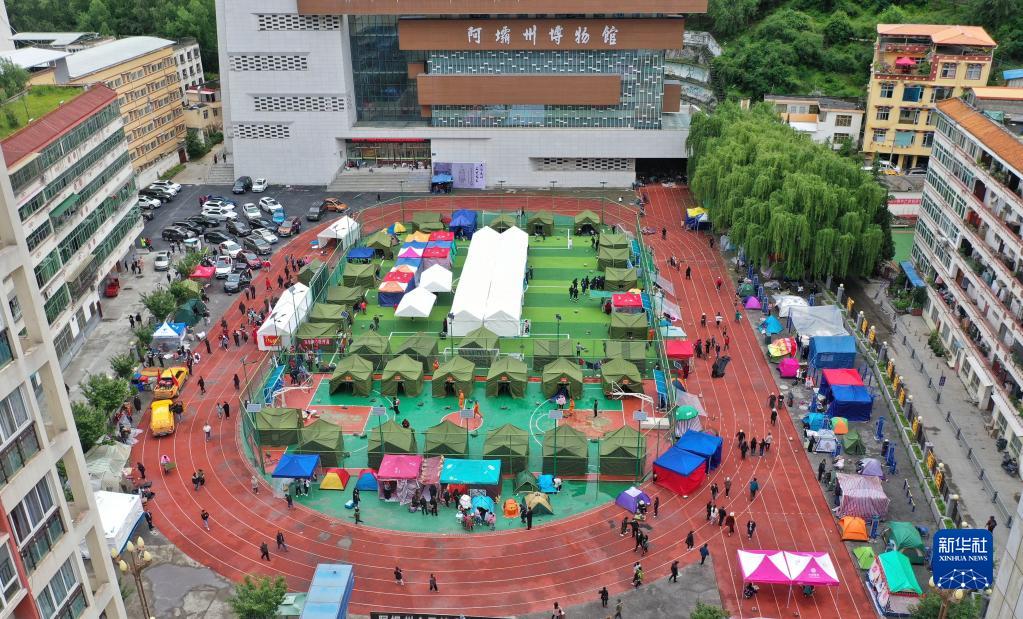 6月10日拍攝的馬爾康市州醫(yī)院背后廣場(chǎng)安置點(diǎn)(無(wú)人機(jī)照片)。新華社記者 劉坤 攝