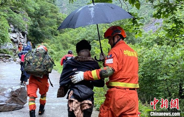 四川森林消防員撐起傘在雨中護(hù)送群眾轉(zhuǎn)移。四川森林消防供圖
