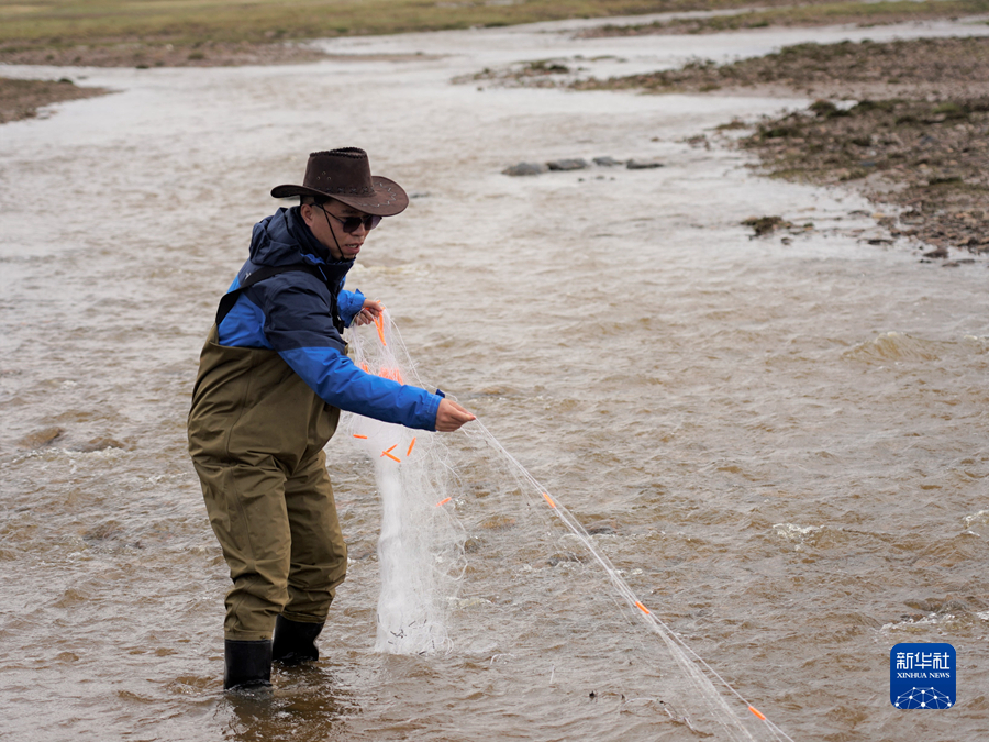6月12日,李偉在長(zhǎng)江南源當(dāng)曲河畔采集發(fā)育成熟的小頭裸裂尻魚(yú)。新華社記者 陳杰 攝