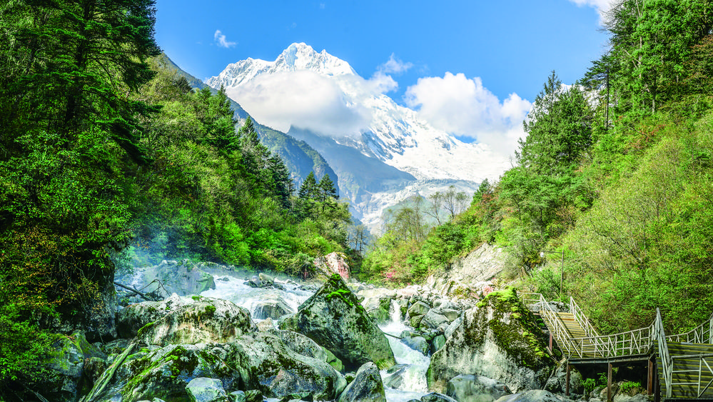 巍峨的雪山、磅礴的冰川、頂級的溫泉、茂盛的原始森林、縹緲的云霧、奇特的紅石景觀、濃郁的民俗風情……初夏時節(jié),走進海螺溝景區(qū),映入眼簾的是“滿目蒼翠一望收,欣欣向榮盛世美”的錦繡景致。