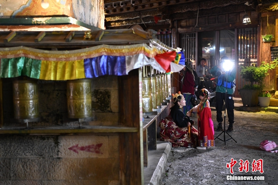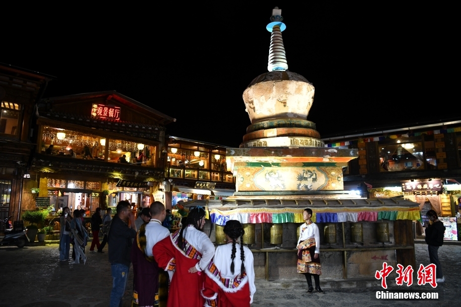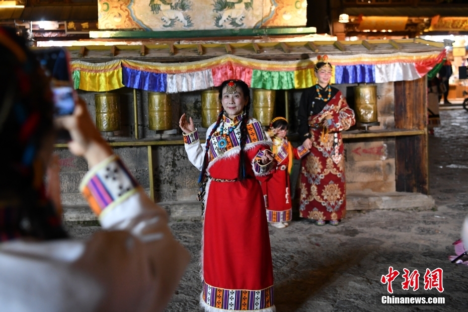 7月11日晚,游客在古城中打卡留念。暑假期間,云南香格里拉市的旅拍市場火熱,游客們穿著藏族服裝變身“扎西”和“卓瑪”,在獨(dú)克宗古城留下旅行中的美好瞬間。中新社記者 劉冉陽 攝