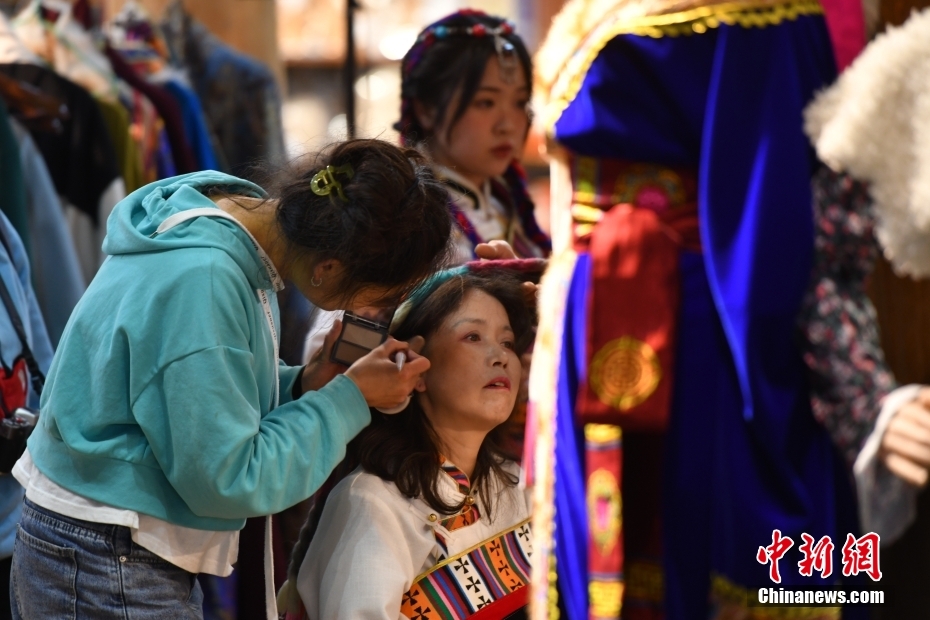 7月11日晚,游客在古城中一家旅拍店化妝。暑假期間,云南香格里拉市的旅拍市場火熱,游客們穿著藏族服裝變身“扎西”和“卓瑪”,在獨(dú)克宗古城留下旅行中的美好瞬間。中新社記者 劉冉陽 攝